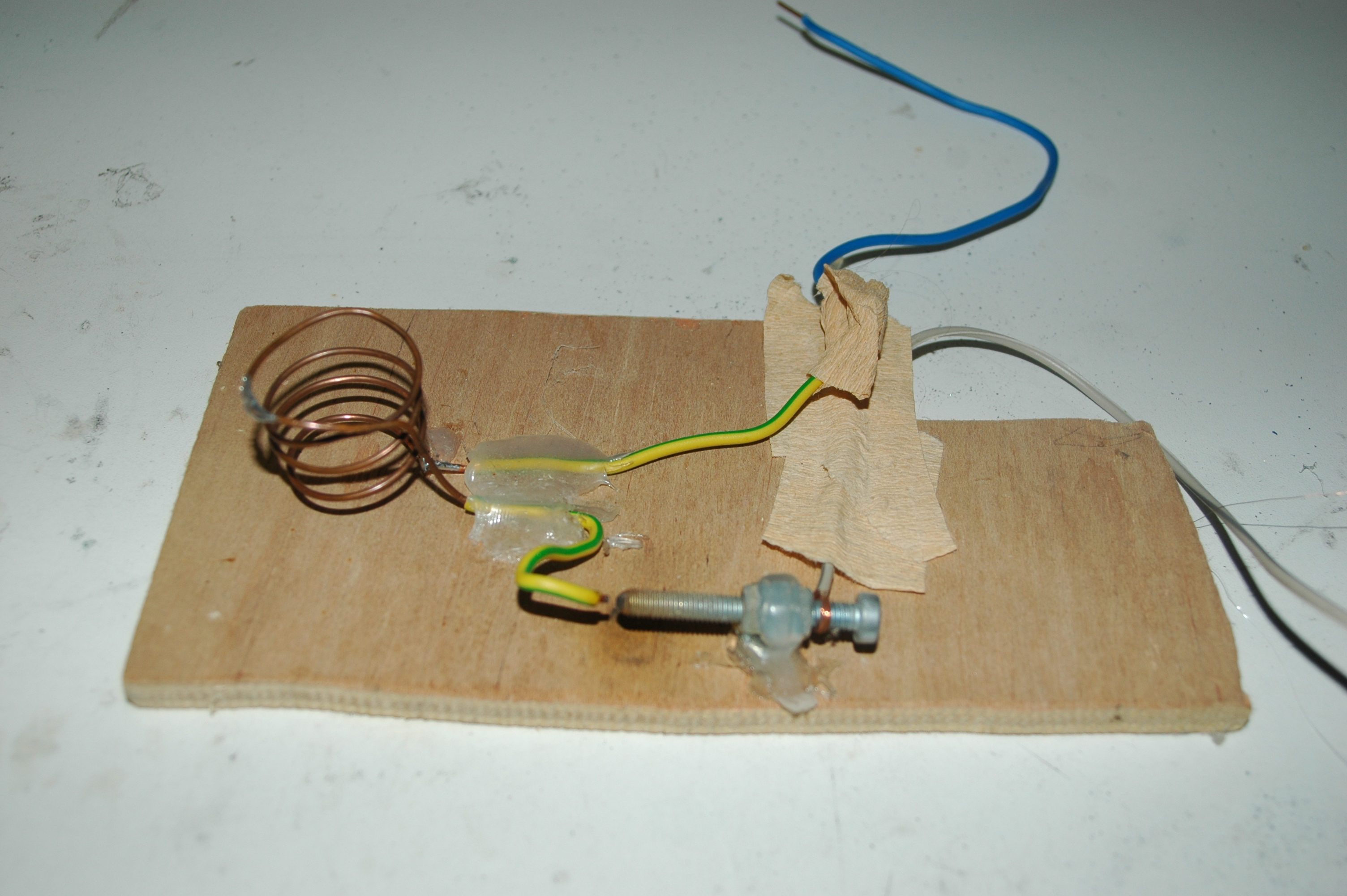 Als Primärspule diente ein Stück 1.5er Installationsdraht mit 5 Windungen. Dazu kamen noch 5 Leydner Cola-Flaschen. Schnell mit Klingeldraht und Kupferresten verkabelt. Als Hochspannungsquelle diente ein alter Zeilentrafo aus einer Plasamkugel mit Sperrschwinger. Die wird ihre 20-30.000V gehabt haben.