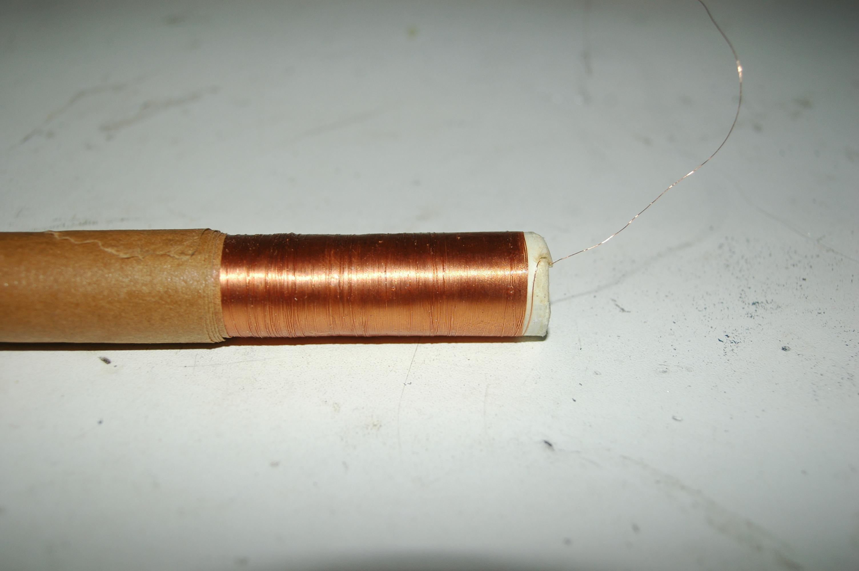 Als Spulenkörper diente ein Stück Papier, kunstvoll zusammengerollt, und verklebt (Heißkleber, weils schnell gehen sollte :P). Dieses haben wir mehr schlecht als recht mit 0.1er Kupferlackdraht bewickelt. Obwohl wir uns wirklich viel mühe gegeben haben, hat sich der Draht an wirklich vielen stellen überlagert. Und ja, der wirklich sch* ...lecht gewickelte teil der Spule befindet sich unter dem Klebeband...