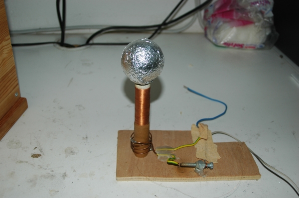 Erst als Ich die ZVS Fertiggestellt habe, kam mir nochmal die Idee, das Ding auszugraben. Beim basteln viel mir ein seltsamer bläulicher Schein in der Pappröhre auf, wenn der Trafo lief - ein schneller Test ergab: da sind kleine Überschläge zwischen den Anschlusskabeln! Das Interesse war wieder geweckt (ehrlichgesagt lässt sich das Gefühl in diesem Momet schwer beschreiben): schnell wurde mit Alufolie ein kleiner Topload gebastelt. Mit diesem Aluball waren ohne irgendwelche Abstimmungen schon 3 cm Entladungen möglich. Irgendwann stellten wir dann fest, dass die Entladungen größer wurden, wenn man die Erde erdet - der Trafo konnte immerhin schon eine ESL-Lampe zum leuchten bringen!
