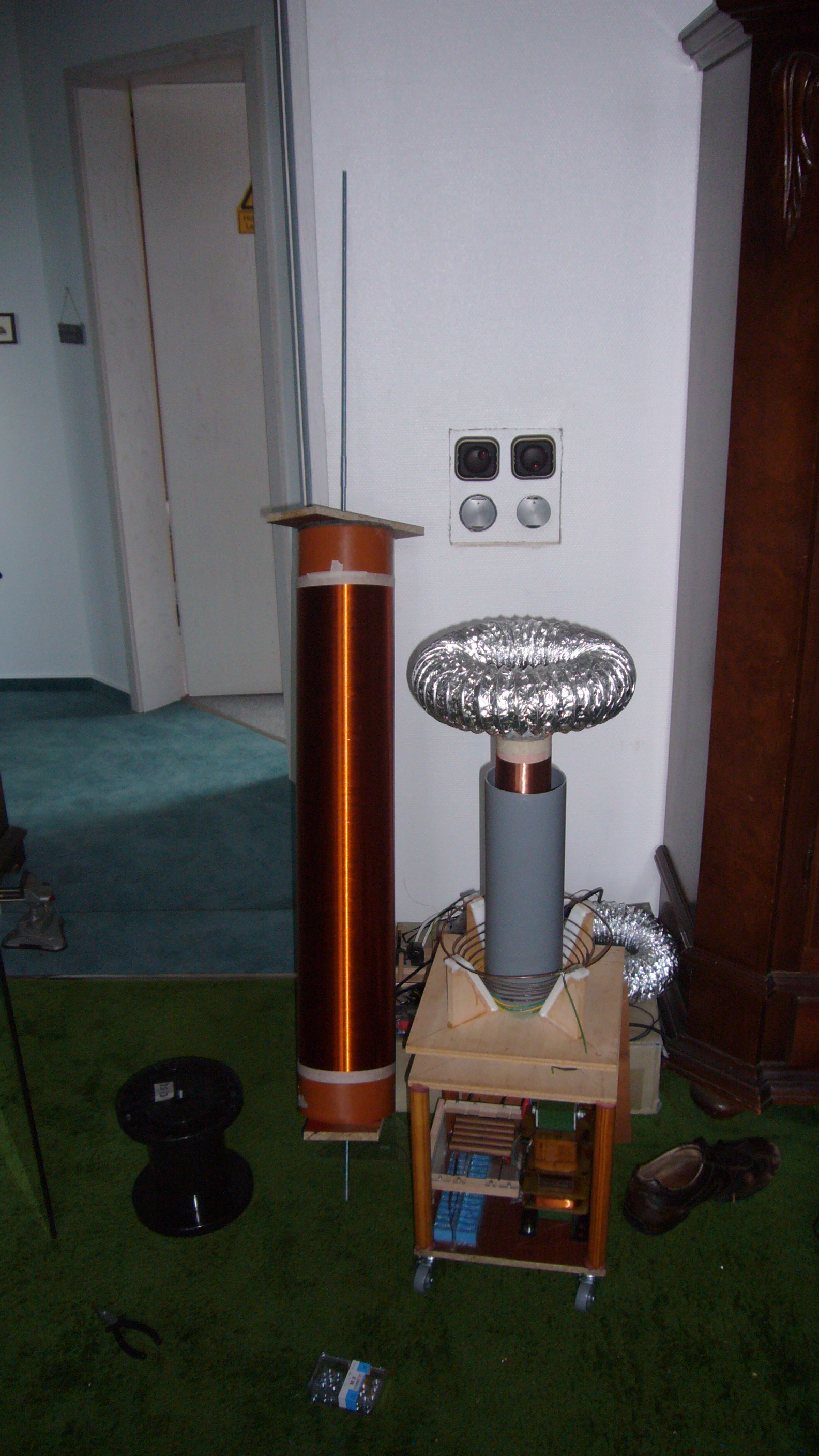 Nach obenNachdem nun ein Jahr vergangen ist, seitdem ich mit der Hochspannungsbastlerei angefangen habe, wollte ich endlich mal was großes bauen. Also wirklich was Großes!, ne großes Teslaspule, was sonst? Naja da man ne VTTC nicht wirklich riesig bauen kann, zu mindestens nicht mit handelsüblichen Röhren, ich von einer DRSSTC keine Ahnung habe und eine SSTC ausscheidet... VIEL zu klein!. Schließlich ist es dann eine SGTC geworden.