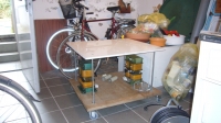 mir die Windungen nicht verrutschen oder bei Temperaturänderungen sogar vom Rohr fallen. Die Sekundärspule ist also fertig. Einige Tage später habe ich beim Nachbarn eine Tür aus mehrfachverleihmten Speerholz gefunden. Kurze Zeit später war diese für die Bodenplatte der Tesla zurechgeschnitten. Natürlich habe ich davor den Nachbarn gefragt, ob ich seine Tür zersägen darf :-) Nunja, jetzt waren schon mal 2 Monate vergangen und ich musste meine Arbeit für 6 Wochen unterbrechen, da ich in England war, um meine englischen Sprachkenntnisse aufzubessern... Als ich dann wieder kam, nach 6 Woche "Tesla-Entzug", wurde natürlich sofort weitergearbeitet. Ein Besuch im Bauhaus war fällig. Also kurzerhand eine Stückliste gefertigt und 3 Stunden später stand ich dann schließlich mit einer Menge Stahl und Kupfer zu Hause. Leider war ich danach auch um einige Euros ärmer. Aber: Es konnte mit dem Bau weitergehen. Nach cirka 1 Woche war dann der Grundaufbau fertig: