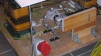und das Steuerpult. Letzteres wird in einer anderen Rubrik beschrieben. Bei der Funkenstrecke habe ich mich für eine Rotary Spark Gap entschieden. Realisiert wurde alles mit einer Flex mit 11.000 RPM und einer sehr präzisen und ausgewuchteten Plexiglas Scheibe. Ihr könnt ich sicher vorstellen, dass mir nie richtig wohl war, als ich diese Plexiglasscheibe rotieren gesehen habe. Wer schon mal eine Frisbee an den Kopf bekommen hat, der wird bei so einer Scheibe die mit 11.000 RPM rotiert in Deckung gehen. Ein weiteren Punkt der Unsicherheit waren die Bolzen in der Scheibe. Diese schalten die Caps auf die Primärspule und das nicht ohne Verluste. Meine Sorge war, dass die Bolzen sich bei Überhitzung aus der Plexiglasscheibe "raus schmelzen" können und dann in irgendeine Richtung fliegen - Möglicherweise auch in mein Gesicht :P