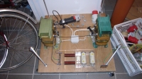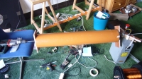 Wasser zu kühlen! Nun nach dem sämtliche Teile geschnitten waren, habe ich mich daran gemacht die Sekundärspule zu wickeln. Nun ja, vorher habe ich alle meine Spulen von Hand gewickelt, allerdings hatte ich bei 1200Wdg, 20cm Durchmesser und einer daraus resultierenden Drahtlänge von 753 Metern wirklich keine Lust die Spule von Hand zu wickeln. Also was machen... Wickelmaschine! Nach cirka 20 Minuten habe ich mir aus einer Bohrmaschine und einem HV-Cap eine Wickelmaschine gebaut.