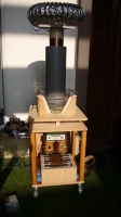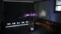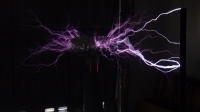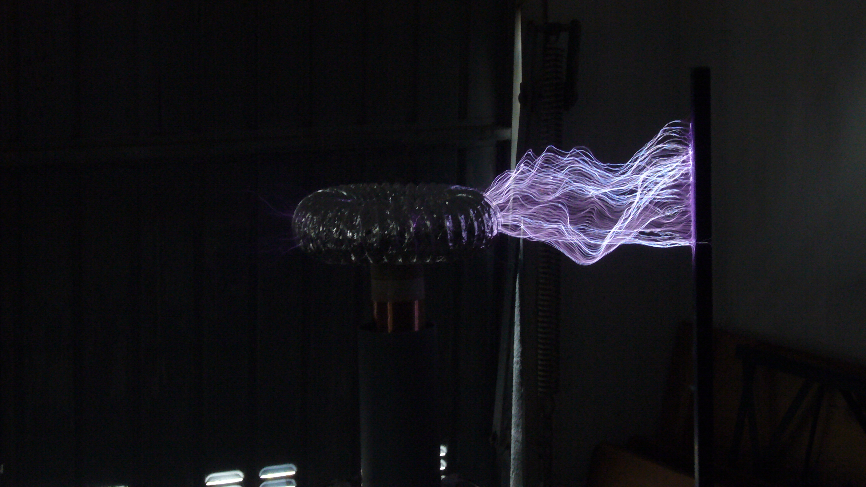 Und schon war das nächste Problem da: dass einzige was ich hatte um die Spule zu versorgen waren 4 OBITs ( Oil Burner Ignition Transformer) mit 10KVACeff also 14,4KVampl. Nun, mein MMC ( Multi Mini Capacitor) war allerdings nur für 11,25KVDC ausgelegt. Also musste ich noch für 30€ Kondensatoren kaufen. Der MMC Umbau hat sich aber gelohnt, da ich nun eine Spannungsfestigkeit von 22,5KV erreicht habe. Also kurzerhand die OBITs angeschlossen und siehe da: 30cm Streamer, was für die Größe der Teslaspule wenig ist. Die OBITs lieferten einfach nicht den benötigten Strom von cirka 150mA sondern nur 80mA. Was lernt man daraus? ==> OBITs sind für große TCs ungeeignet. Also musste ich dann, mal wieder, für teuer Geld ein Neontrafo im Ebay ersteigern. 1 Woche später klingelte es an der Tür, ich laufe voller Vorfreude nach unten und nehm dem Postboten das Paket mit dem Trafo ab. 20 Minuten später blitzt und kracht es im Keller. Später habe ich festgestellt, dass die gelieferten 4KV vom Neontrafo zu wenig sind, was mich dann aber nicht weiter gestört hat. Nach 2 Wochen war die Teslaspule komplett fertig und dauerbetriebsfähig. Leider musste ich feststellen, dass die TC nach cirka 1 Minute aufgehört hat zu funktionieren, WARUM?. Ganz einfach, die Funkenstrecke produziert eine nicht ganz vernachlässigbare Menge an O3 ( Ozon) und anderen ionisierten Gasen, und diese bewirken wiederum, dass die Funkenstrecke nicht mehr richtig zündet. Da es sich hier nur um Gase handelt konnte ich dieses Problem ganz einfach beheben, indem ich ein Lüfter über der Funkenstrecke montiert habe. So genug Text, jetzt gibts Resultate: