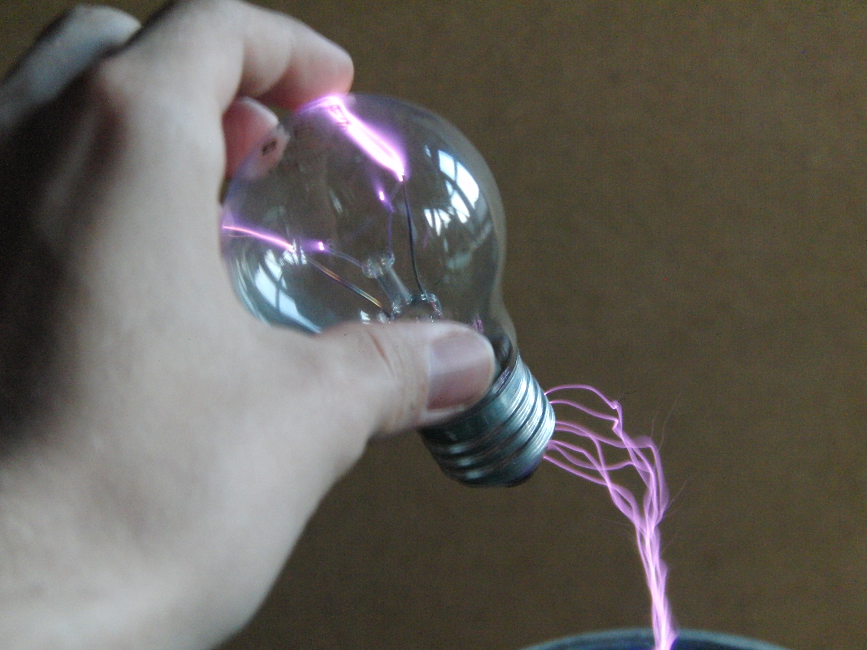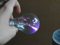 Nach obenHält man eine klare Glühbirne in die Nähe eines Teslatrafos gibt es in der Glühbirne Entladungen wie in einer Plasmakugel. Diese sind auch gerne etwas stärker als die aus dem Topload - weil in dem Unterdruck der Glühbirne die Feldemission ein leichteres Spiel hat ;)
