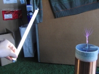 Für diesen Versuch braucht man einen normalen Teslatrafo, und eine 2. Sekundärspule, die auch auf die Resonanzfrequenz des Teslatrafos abgestimmt ist. Stellen wir diese Spule irgendwo in die näher der Teslaspule, und erden sie, werden wir feststellen, dass aus dem Topload des Teslatrafos keine oder kaum Entladungen stattfinden - dafür die 2. Sekundärspule eifrig am Funken sprühen ist.