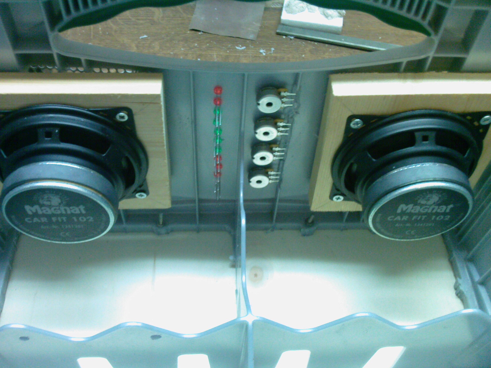 Die Boxen könnt ihr auf ein Stück Holz schrauben, in welches ihr zuvor ein großes Loch gebohrt habt, das erleichtert das montieren der Boxen am Kasten.