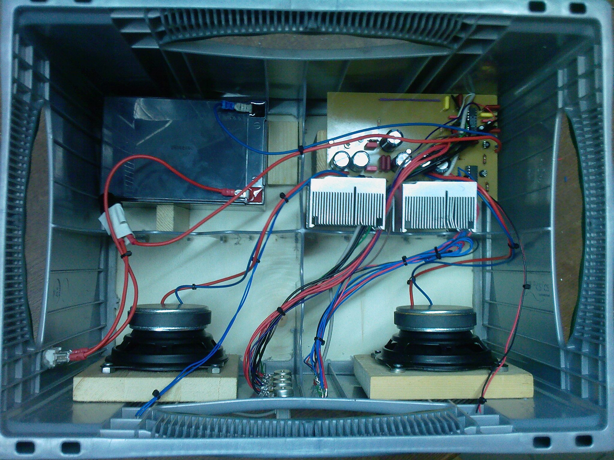 Die 2 Verstärker ICs müssen selbstverständlich mit Kühlkörpern versehen werden um die Wärme die durch Verluste in ihnen entstehen abzuführen, da sie sonst überhitzen.