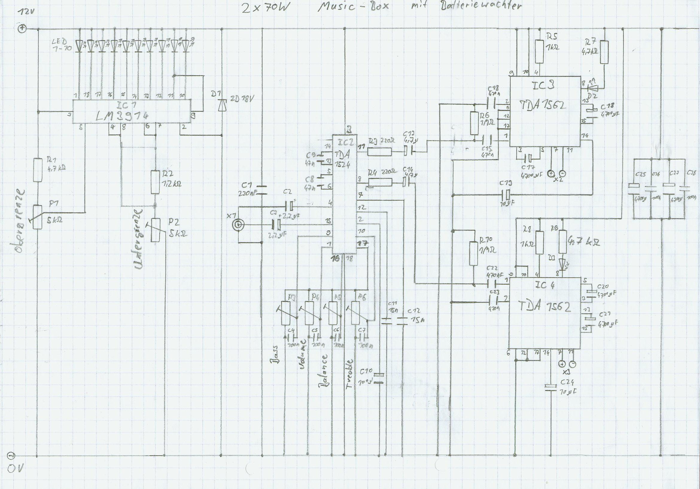 Der Eigentliche Verstärker bilden zwei TDA1562 ICs, welche bei 4Ohm Lautsprecher bis zu 70W liefern !